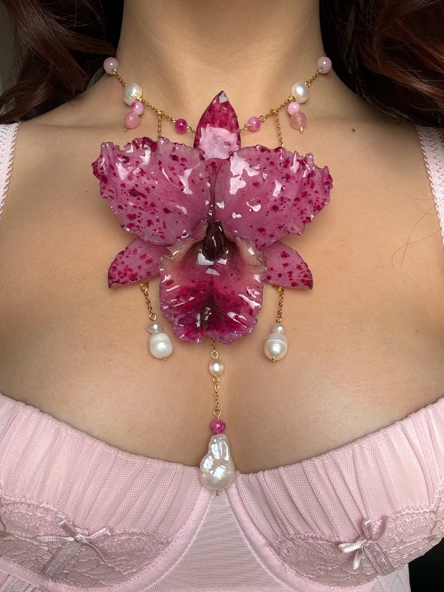 Every piece is handmade by me, from start to finish. Each flower is dried for weeks, preserved in resin over several hours, and then shaped into a necklace that can take up to eight hours to complete. Dolalette is more than jewelry, it’s wearable art created from nature.