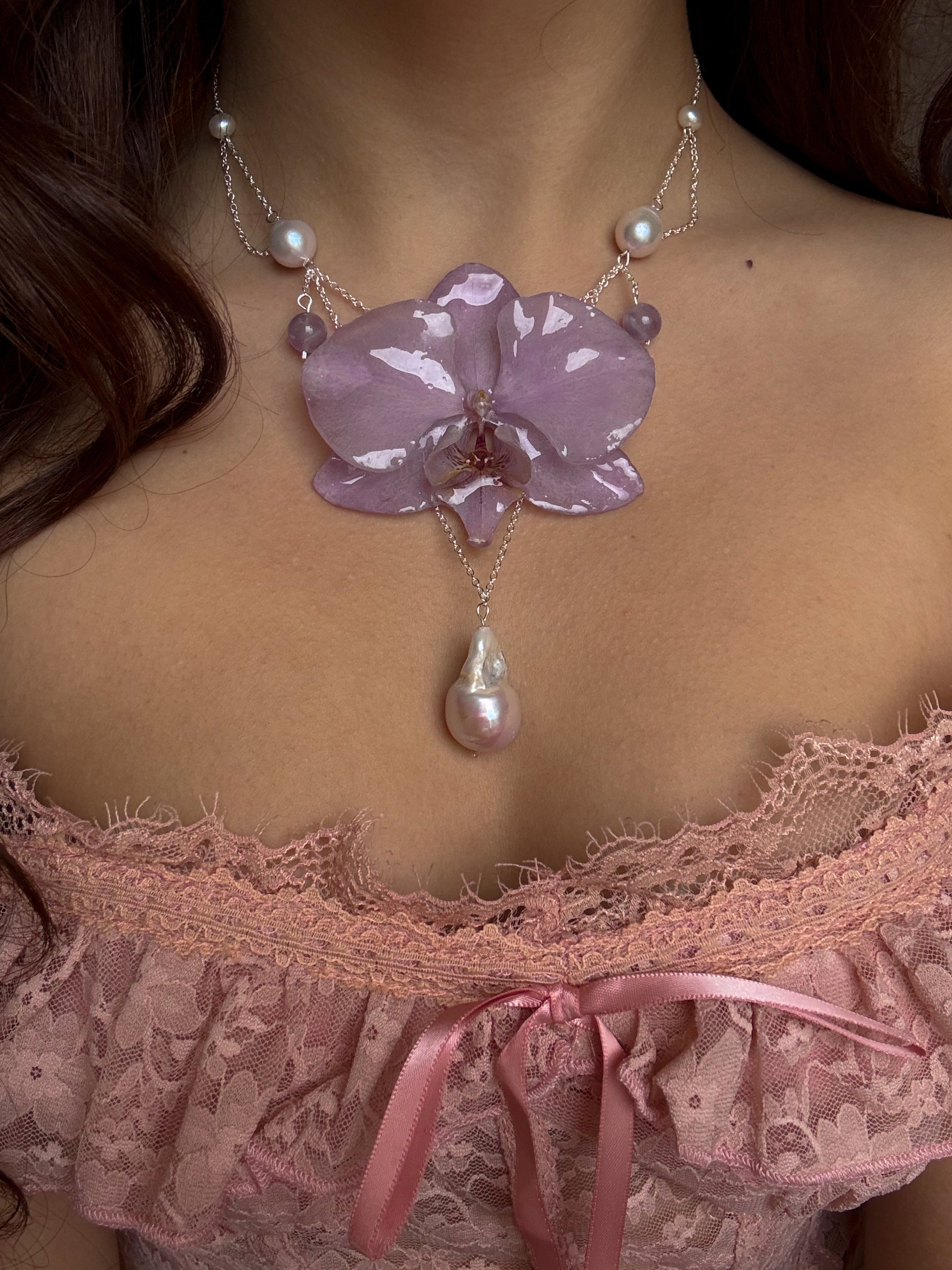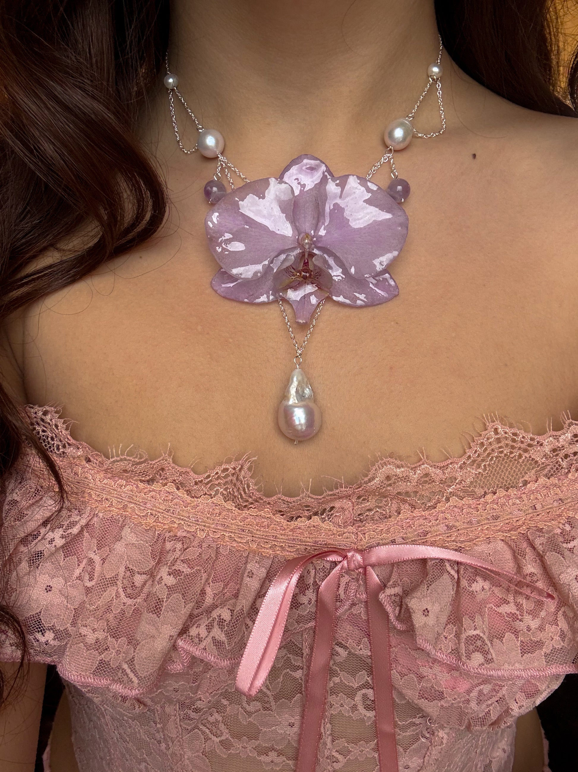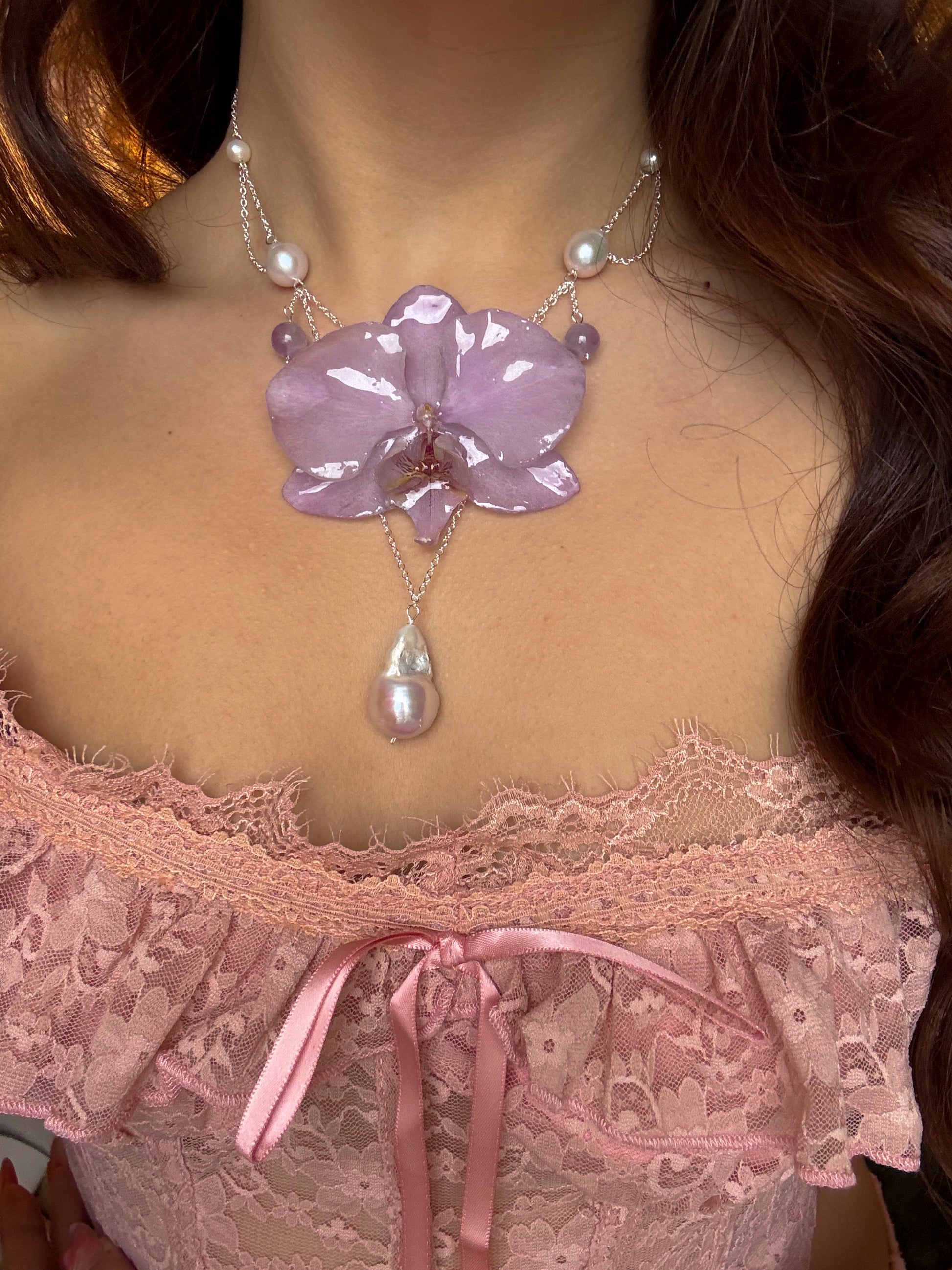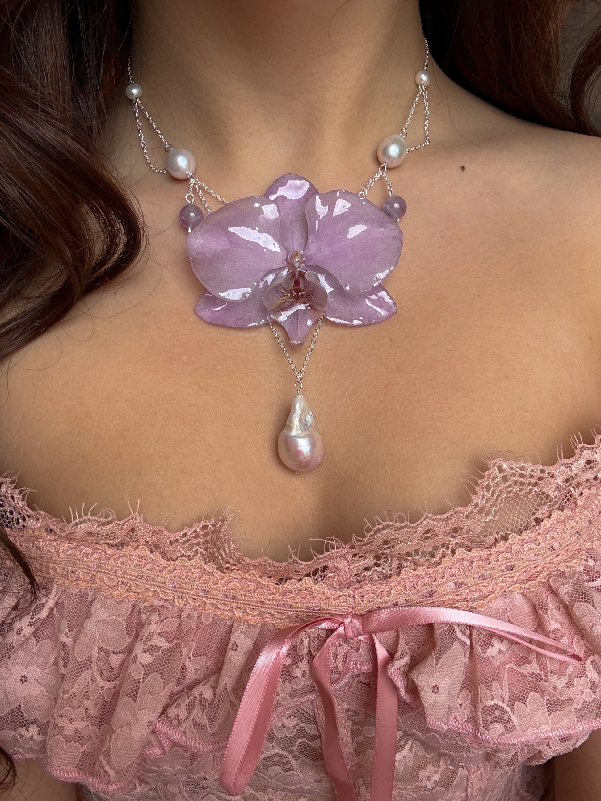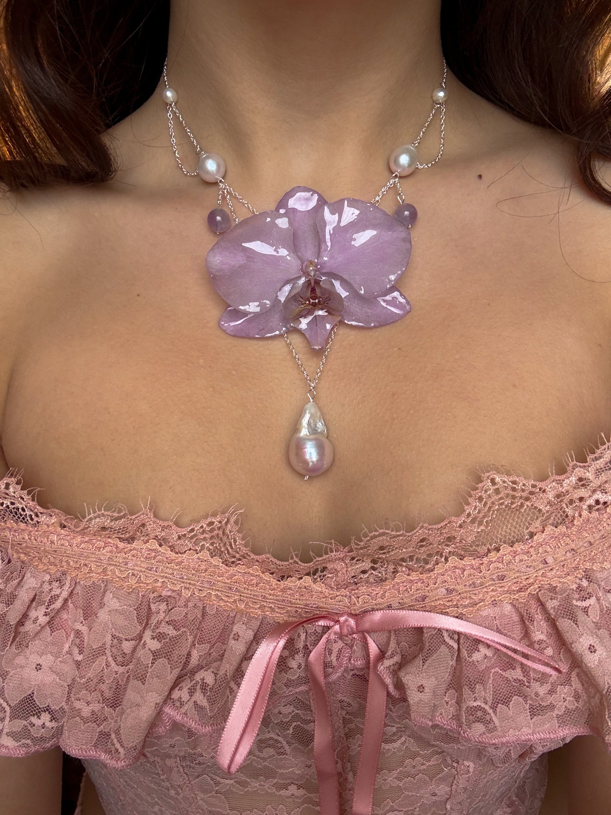 Real preserved lilac Phalaenopsis orchid with freshwater pearls, keshi pearls, and amethyst beads on a 925 silver plated chain.