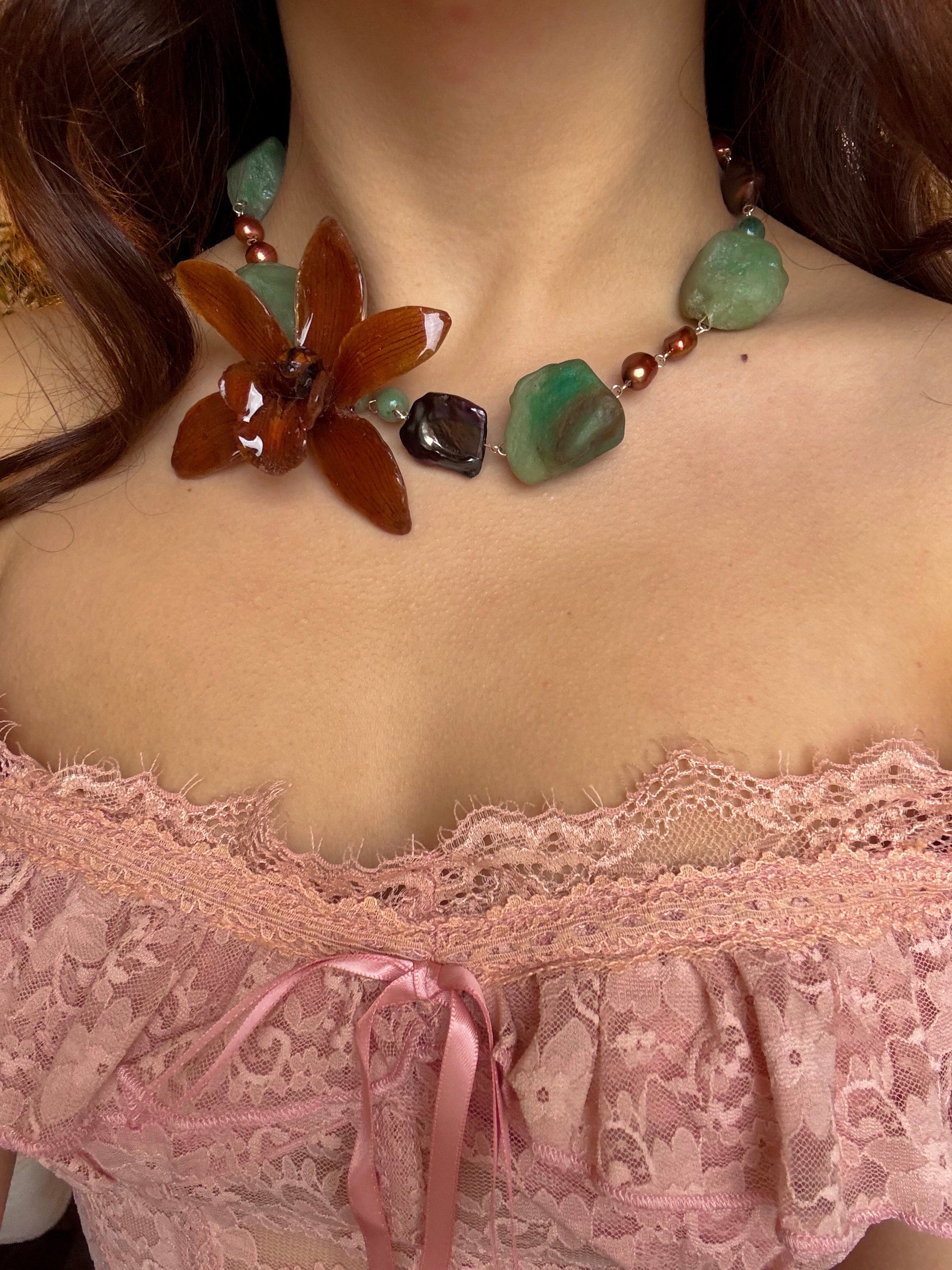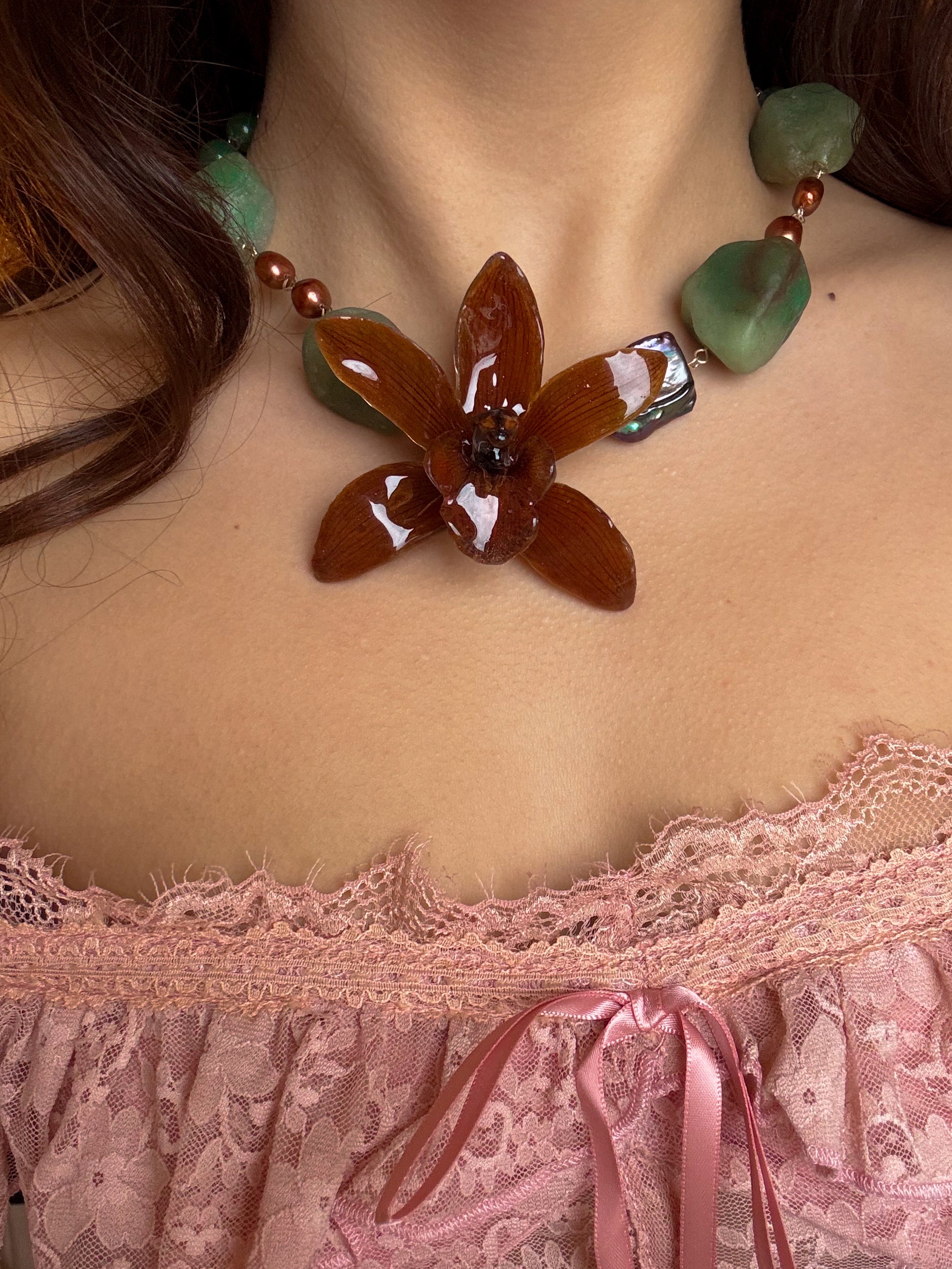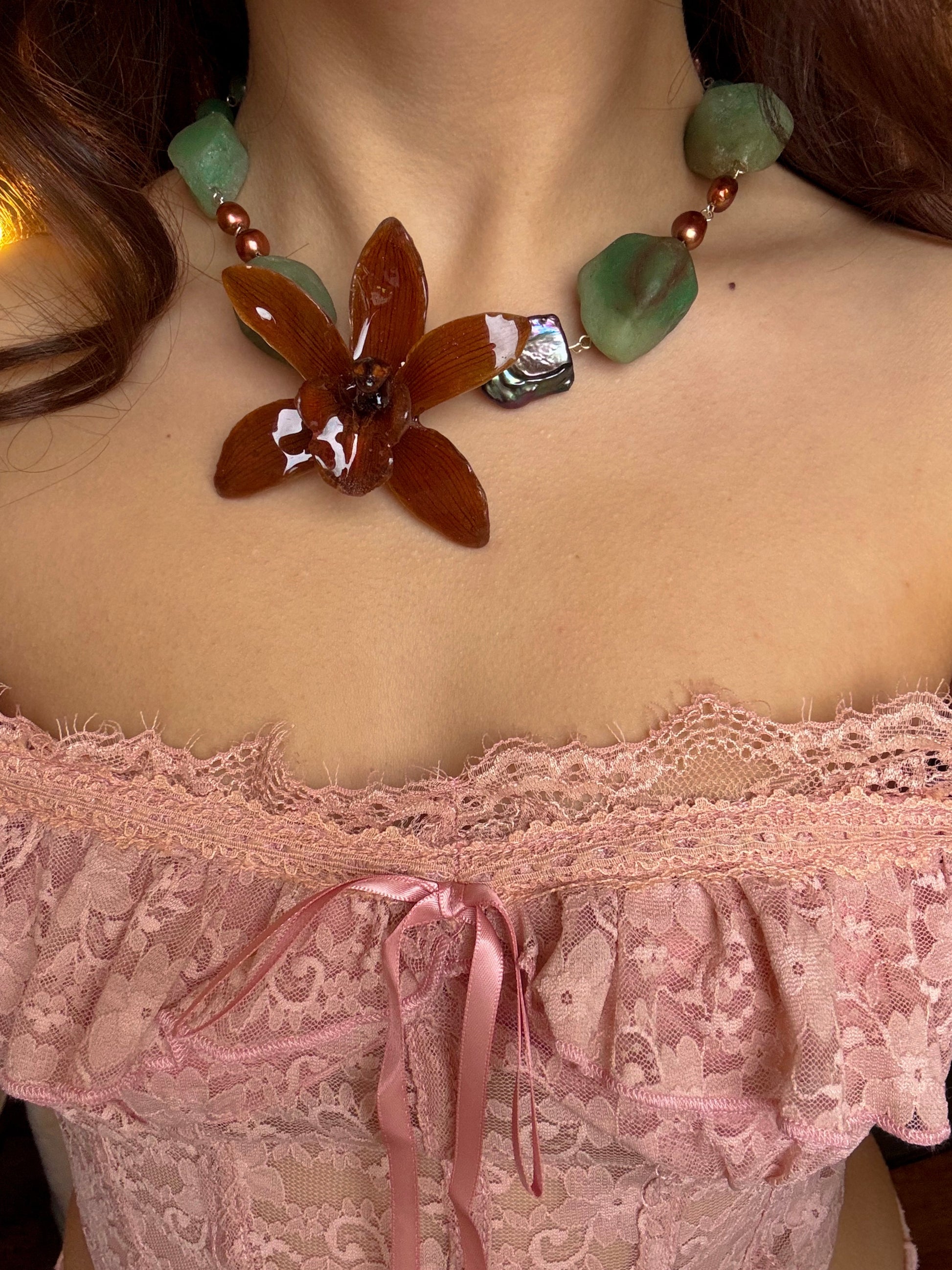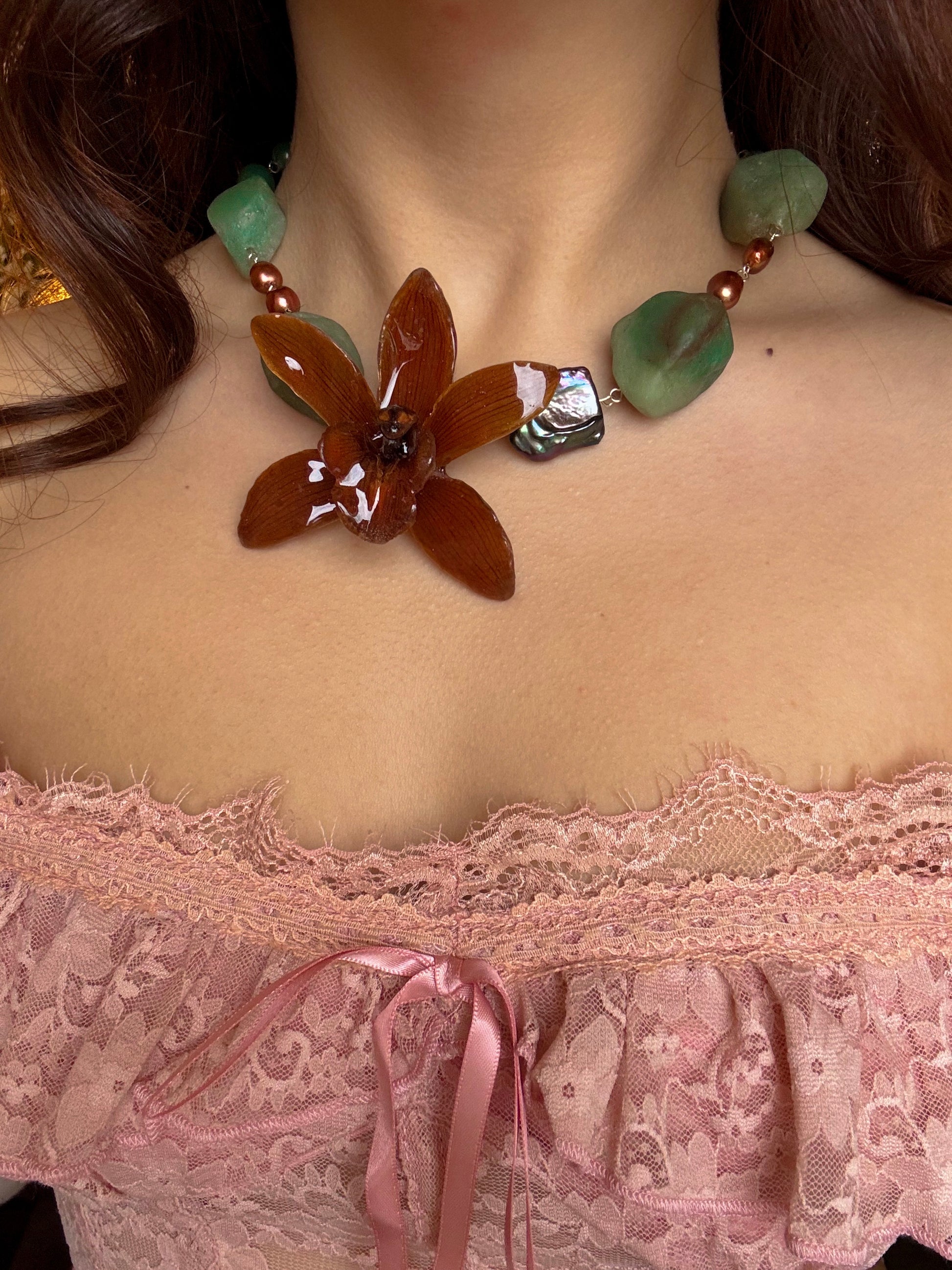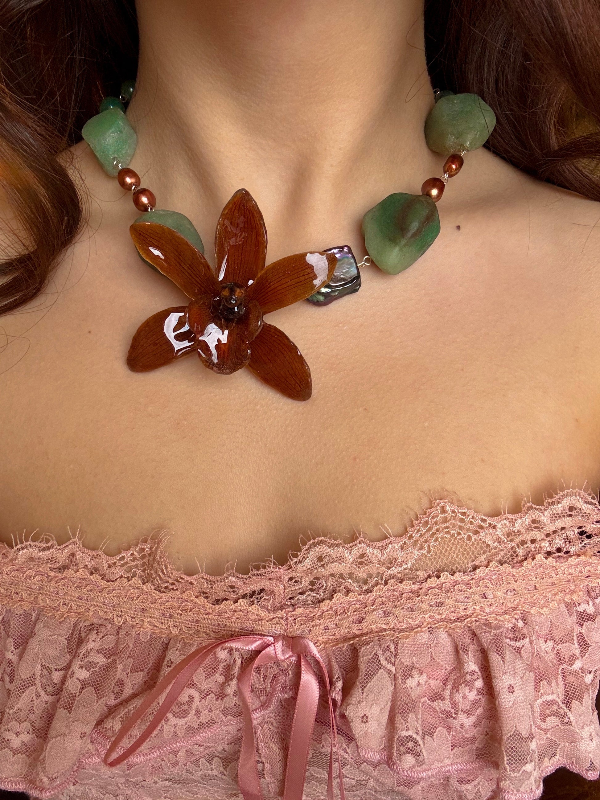 Real preserved brown Cymbidium orchid with green aventurine stones, keshi and freshwater pearls, and 925 silver plated hardware