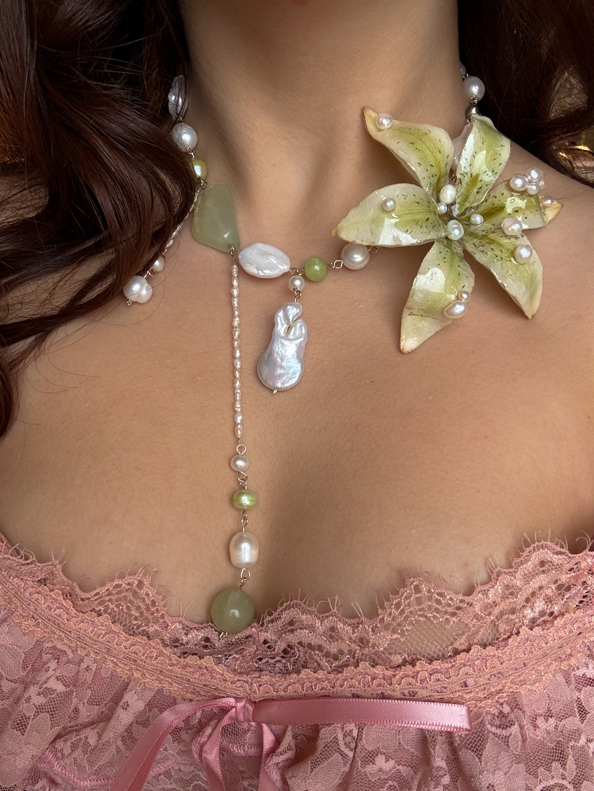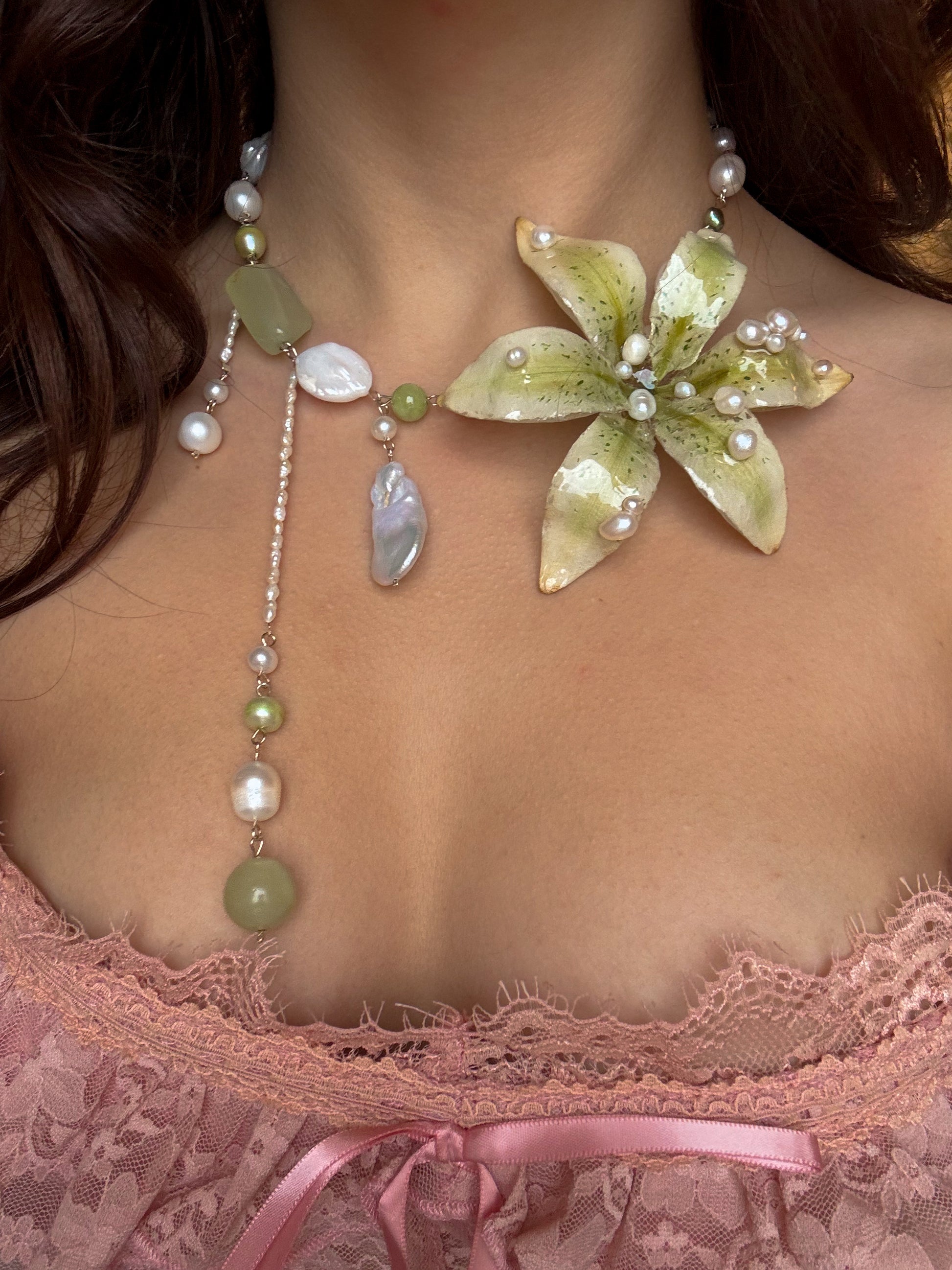 Real preserved green lily, natural jade stones, freshwater pearls, keshi pearls, and baroque pearls with 925 silver plated chain
