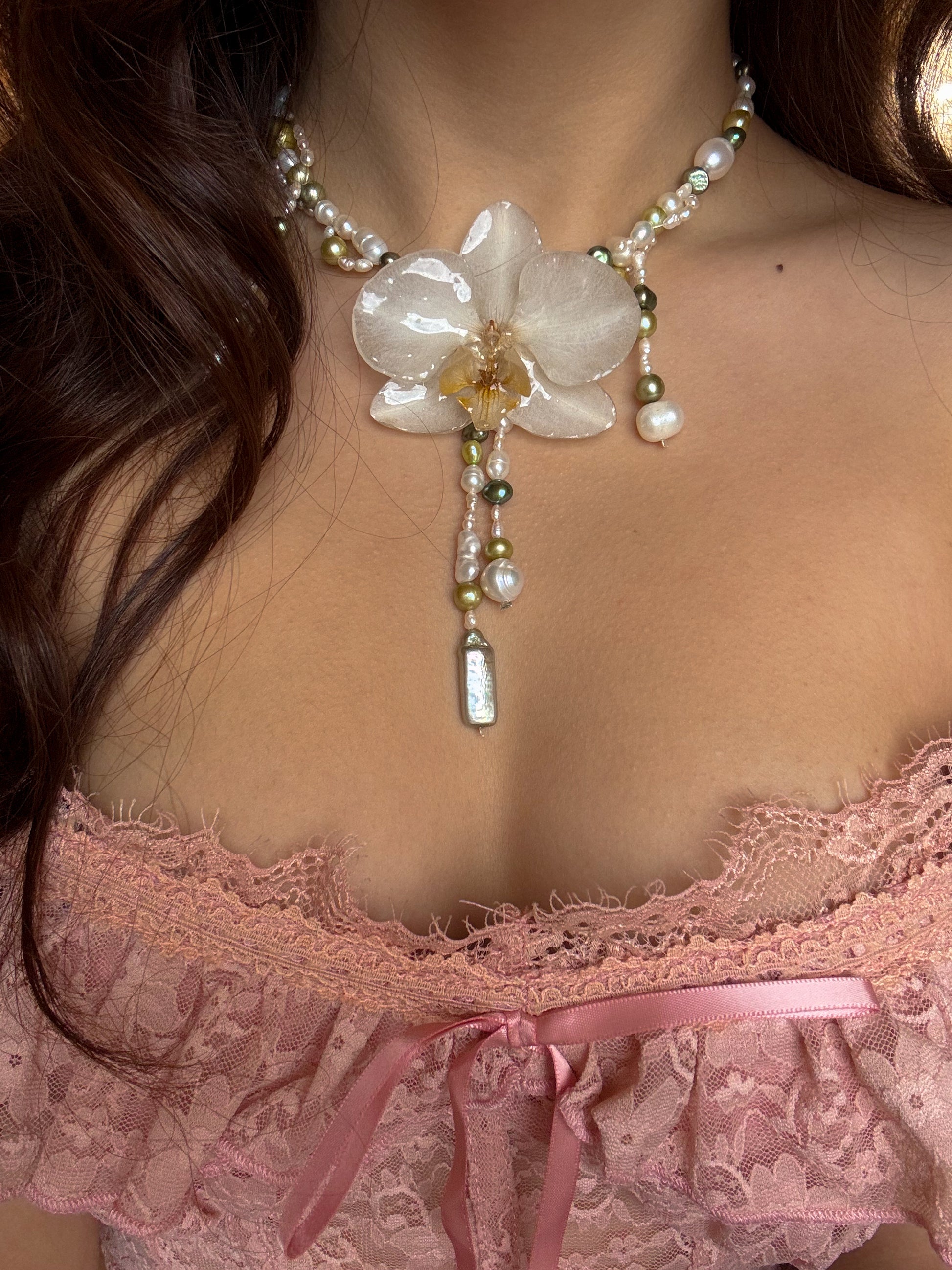 Real preserved ivory Phalaenopsis orchid with green and white freshwater and saltwater pearls and 925 silver plated hardware