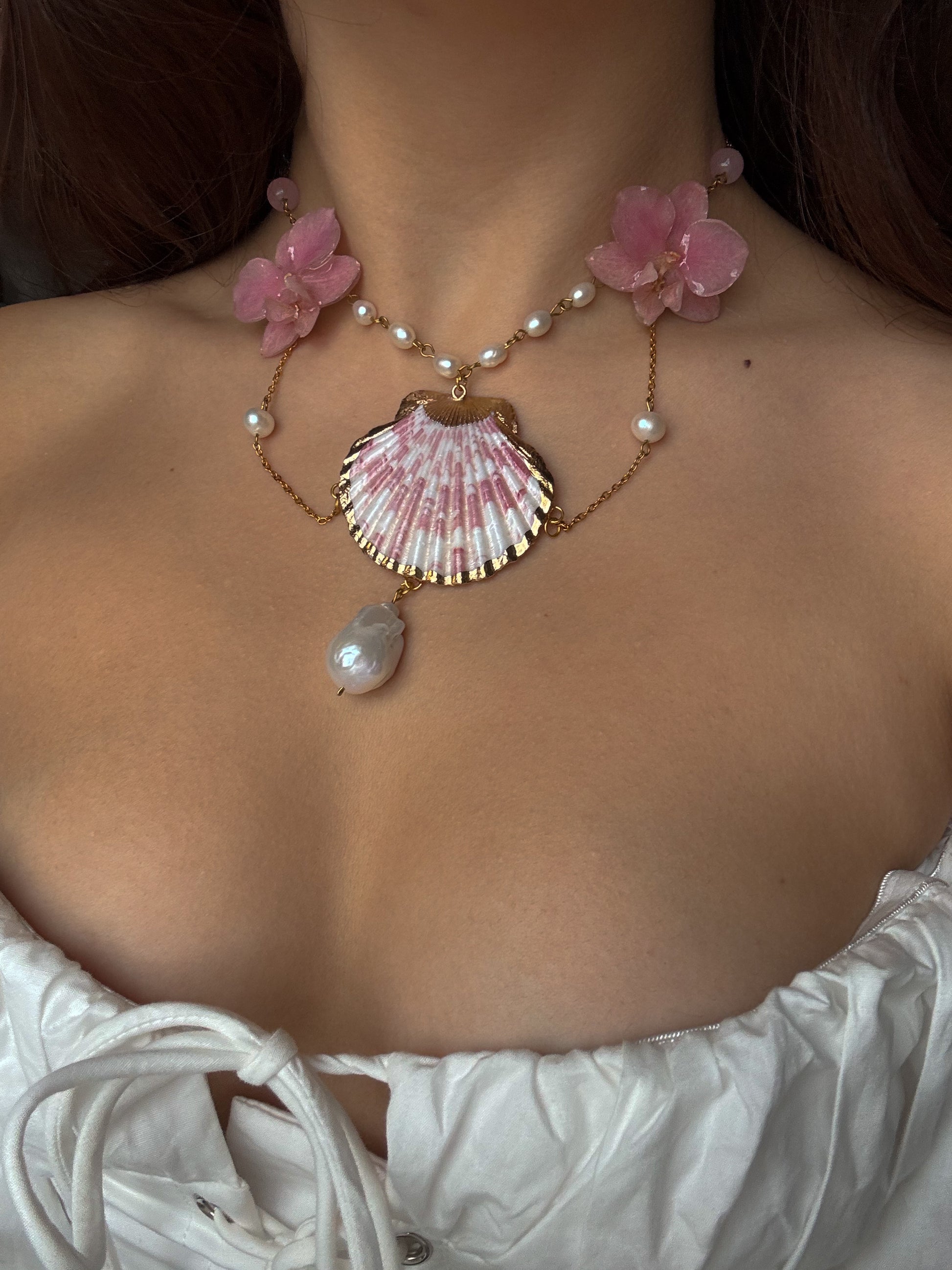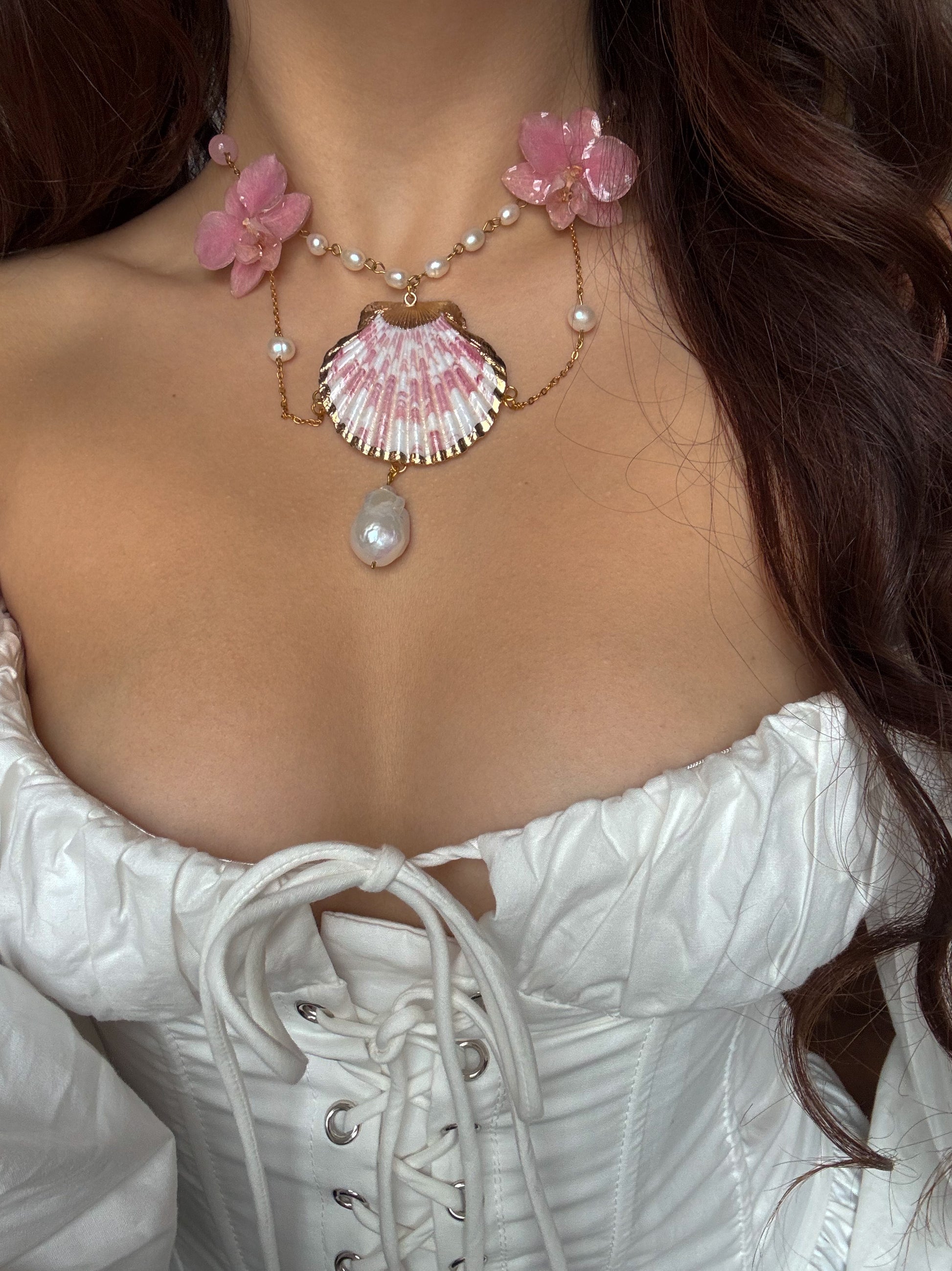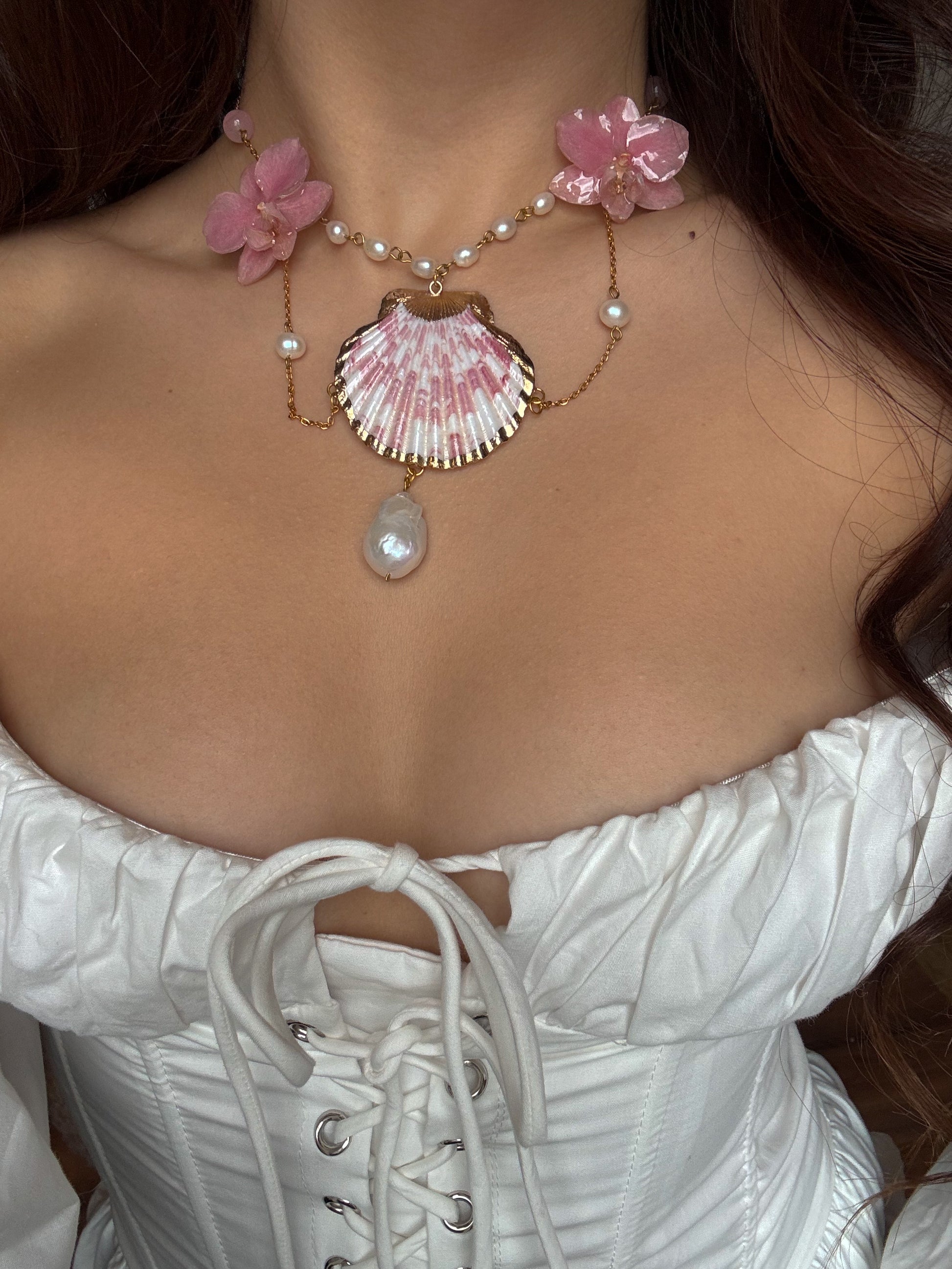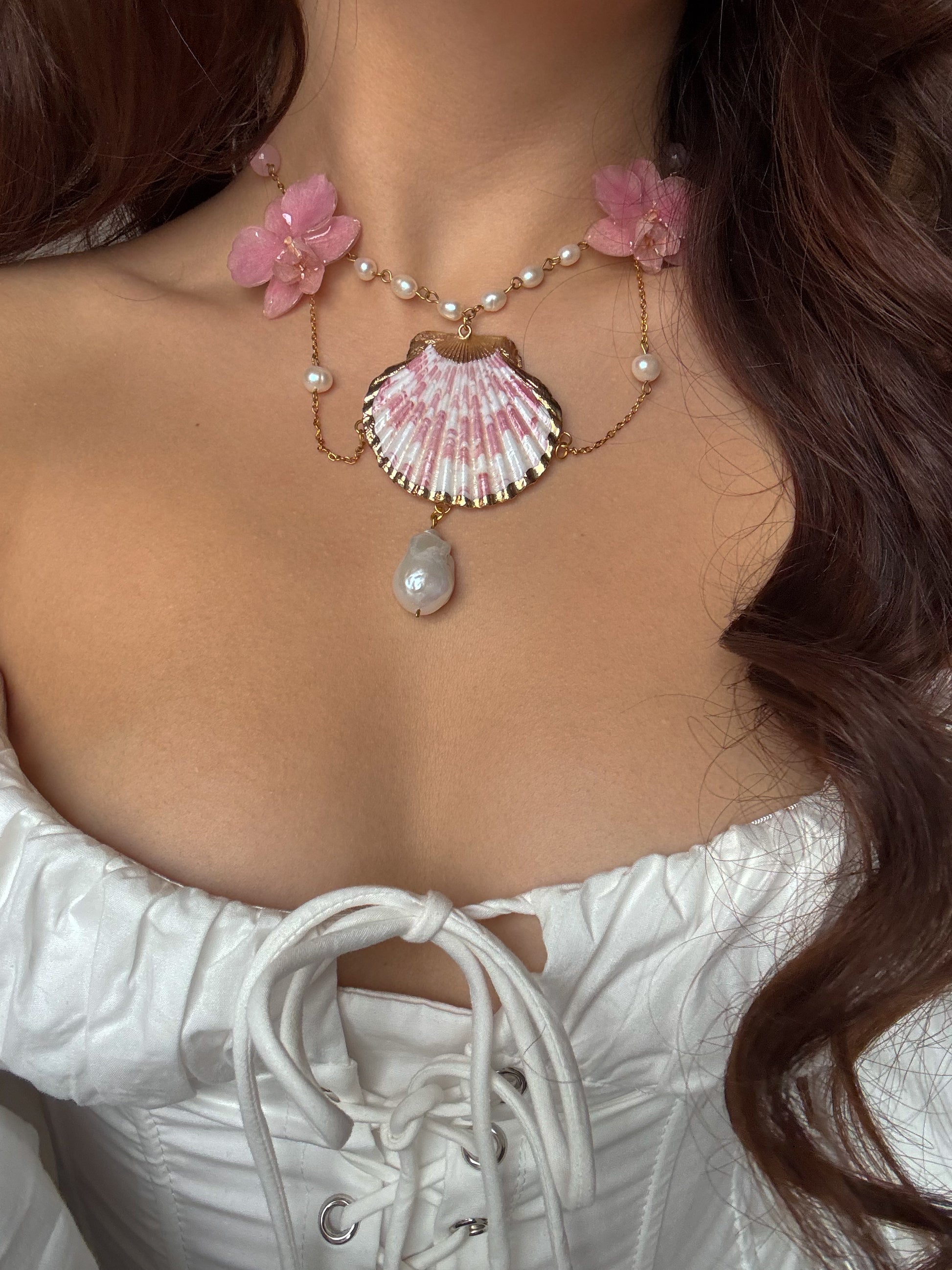 The triple face of womanhood, bound in one tide. She is creation, temptation, and ending: each petal a stage of becoming. The shell at her center mirrors the moon’s turning, eternal and precise, a reminder that every beauty carries the memory of what it has outgrown.