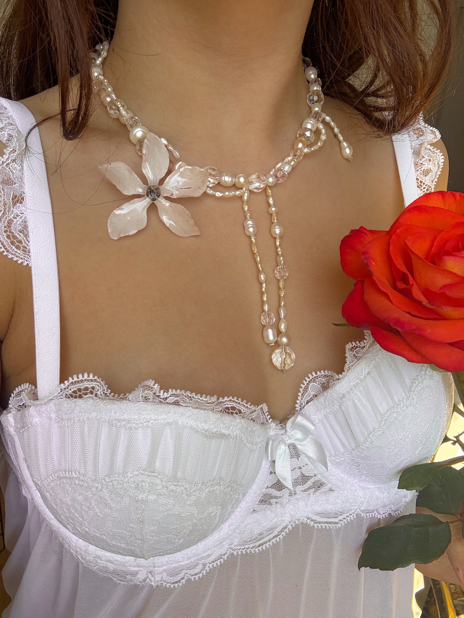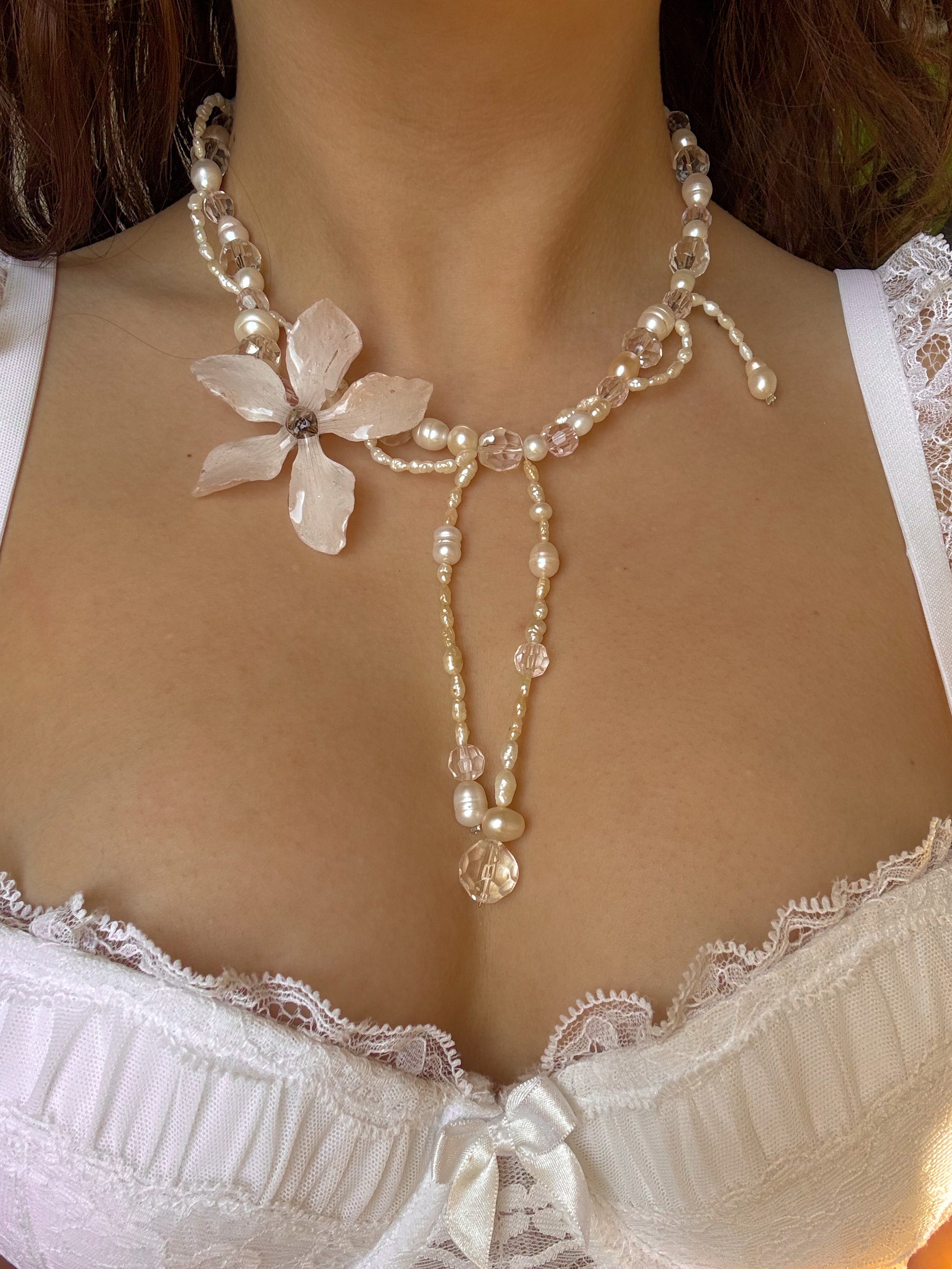 Handcrafted real flower necklace with baroque pearls and glass beads.