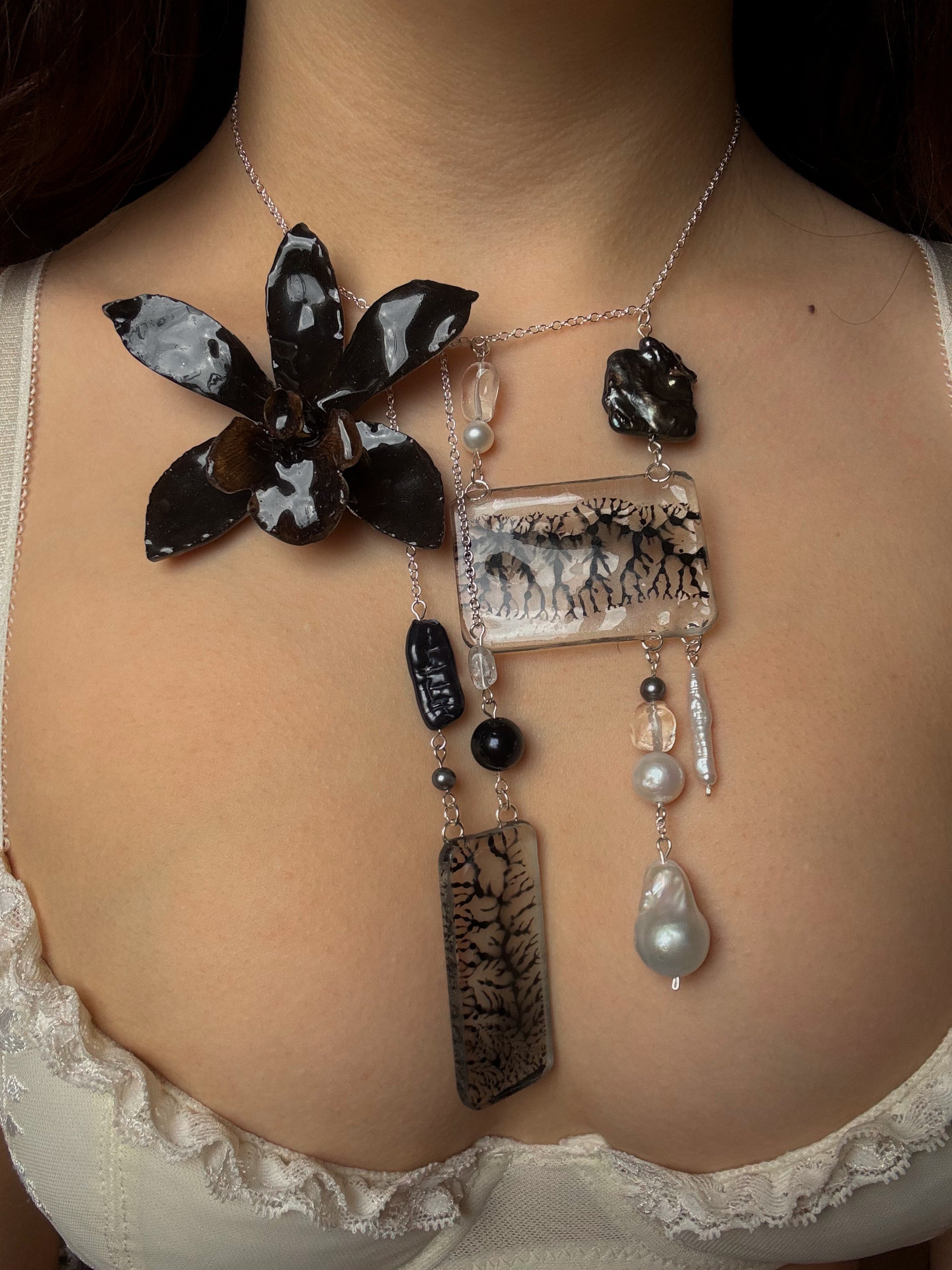 Preserved cymbidium with handmade glass elements, crystals, freshwater and peacock pearls.