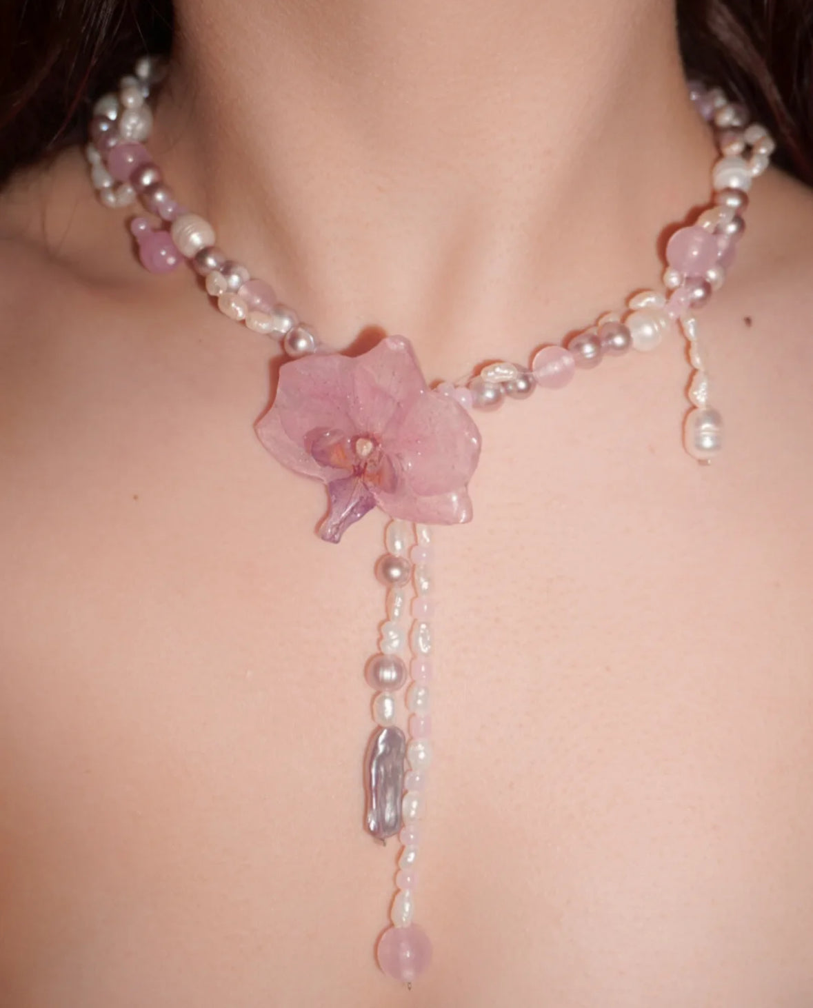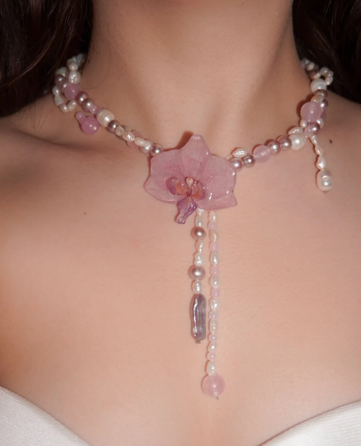 Crafted from a real orchid, rose-toned gemstones, and freshwater pearls.