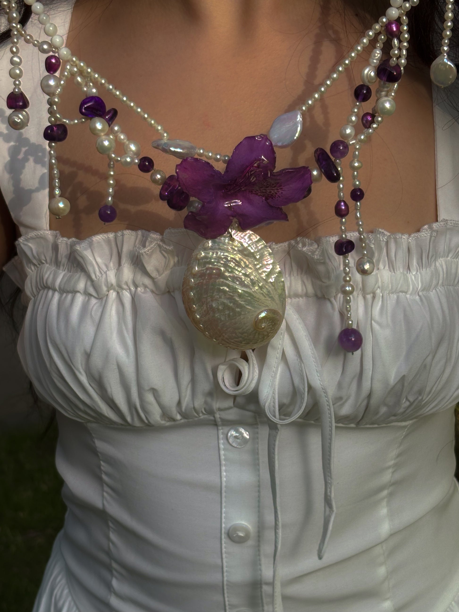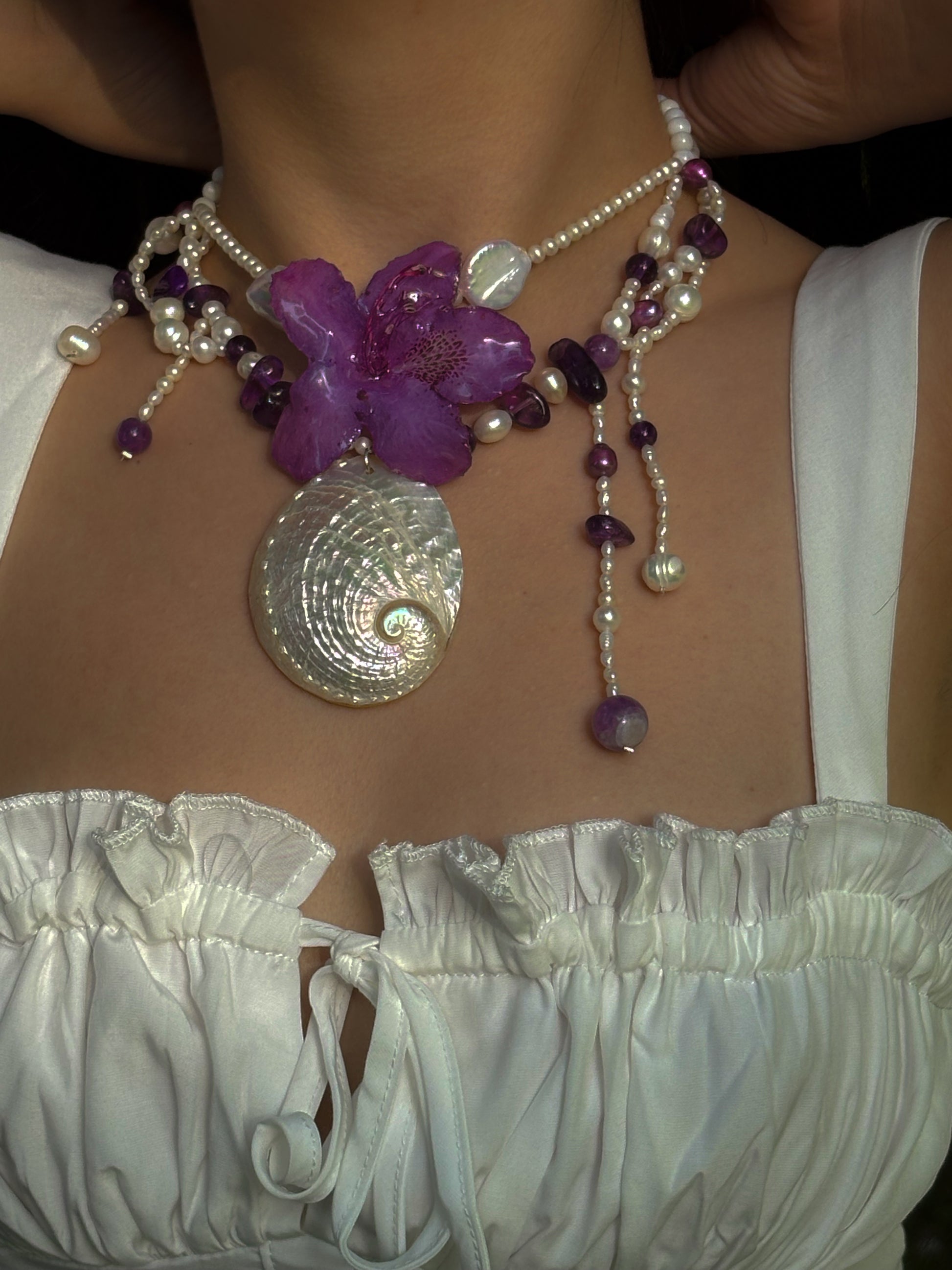 A regal relic from siren-infested shores. Purple bloom, spiral shell, sea-worn pearls and amethyst