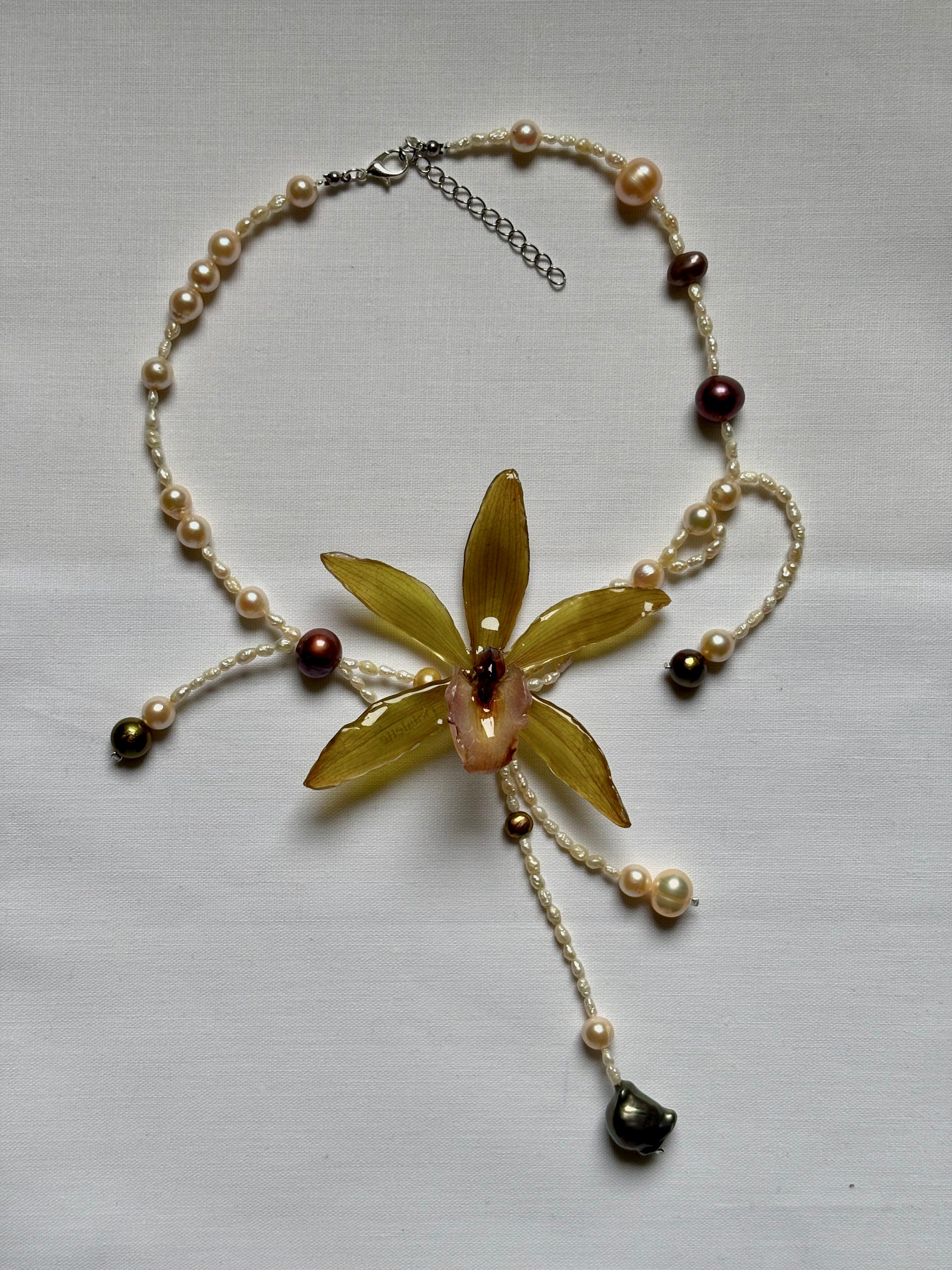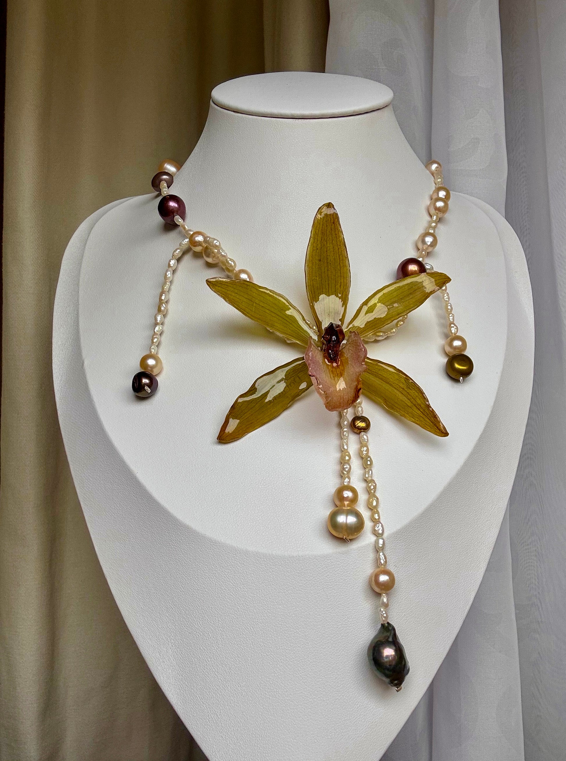 An olive orchid with shifting pearls — born of salt, moss, and memory