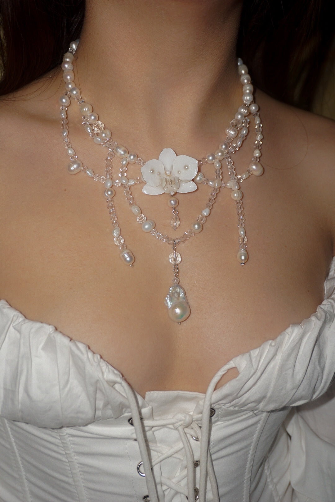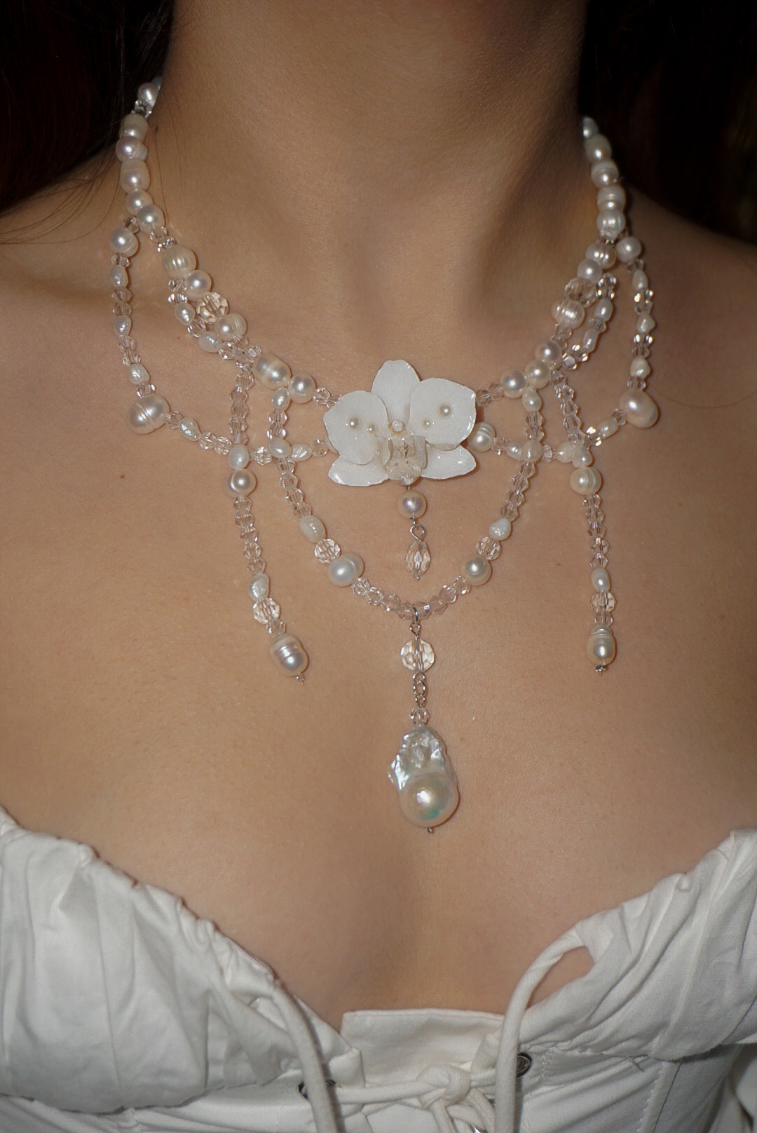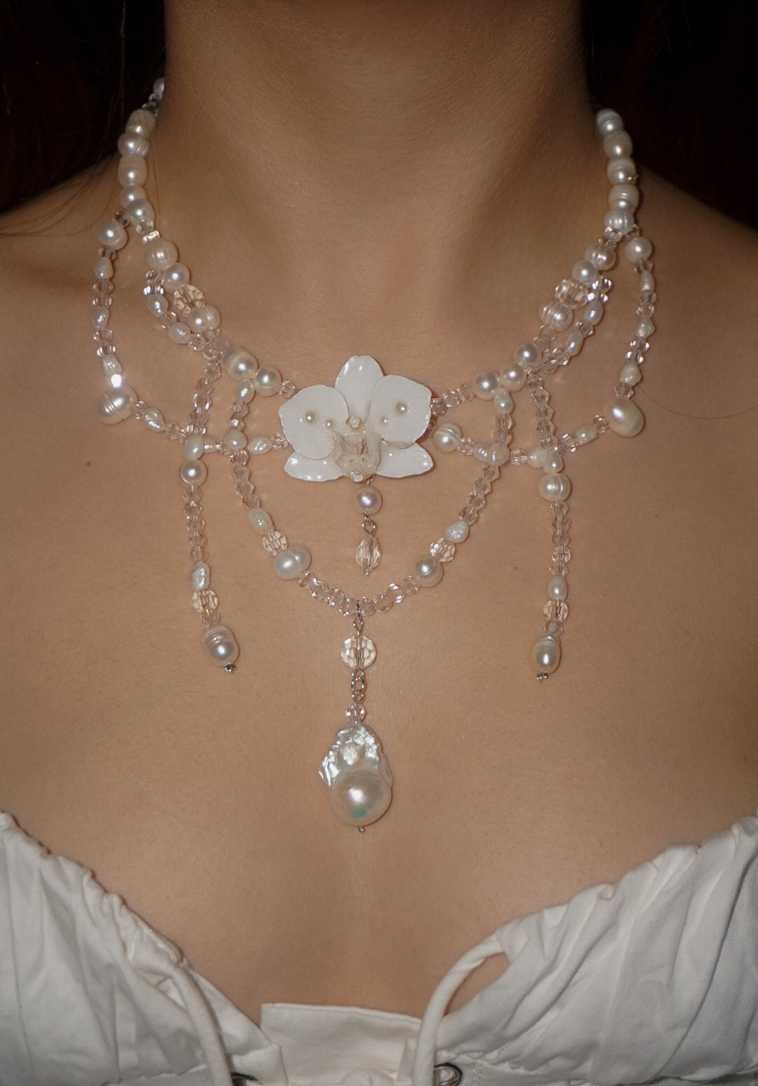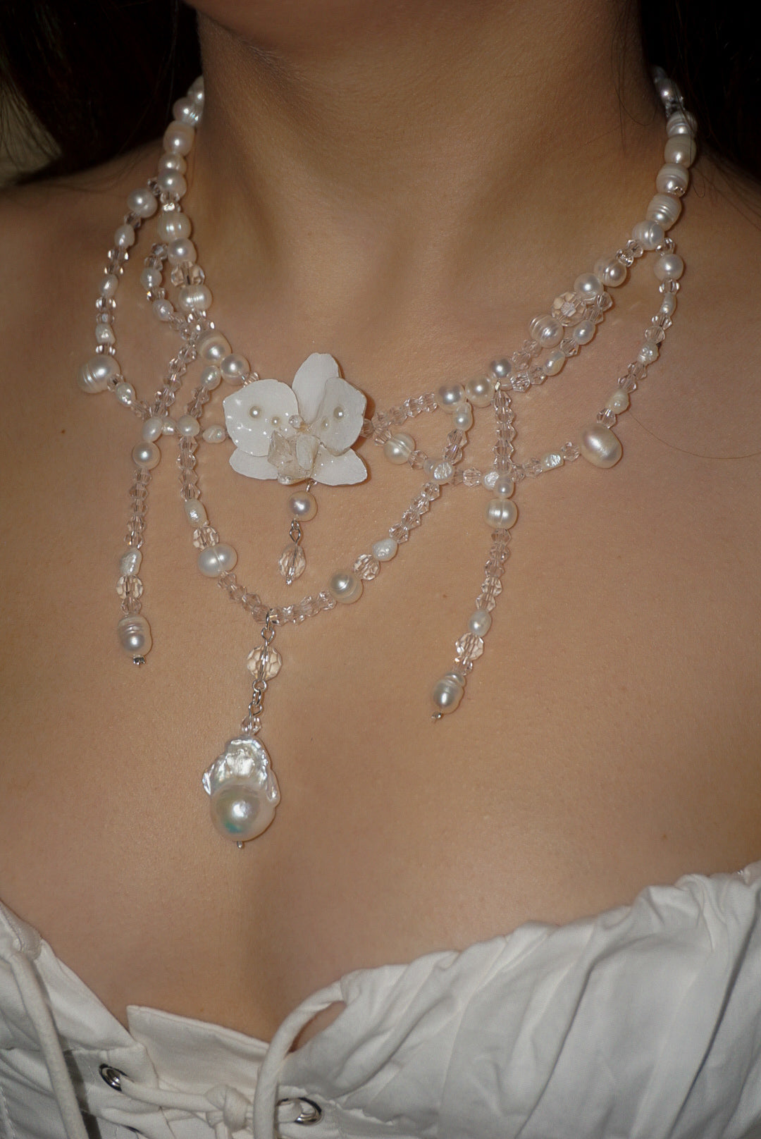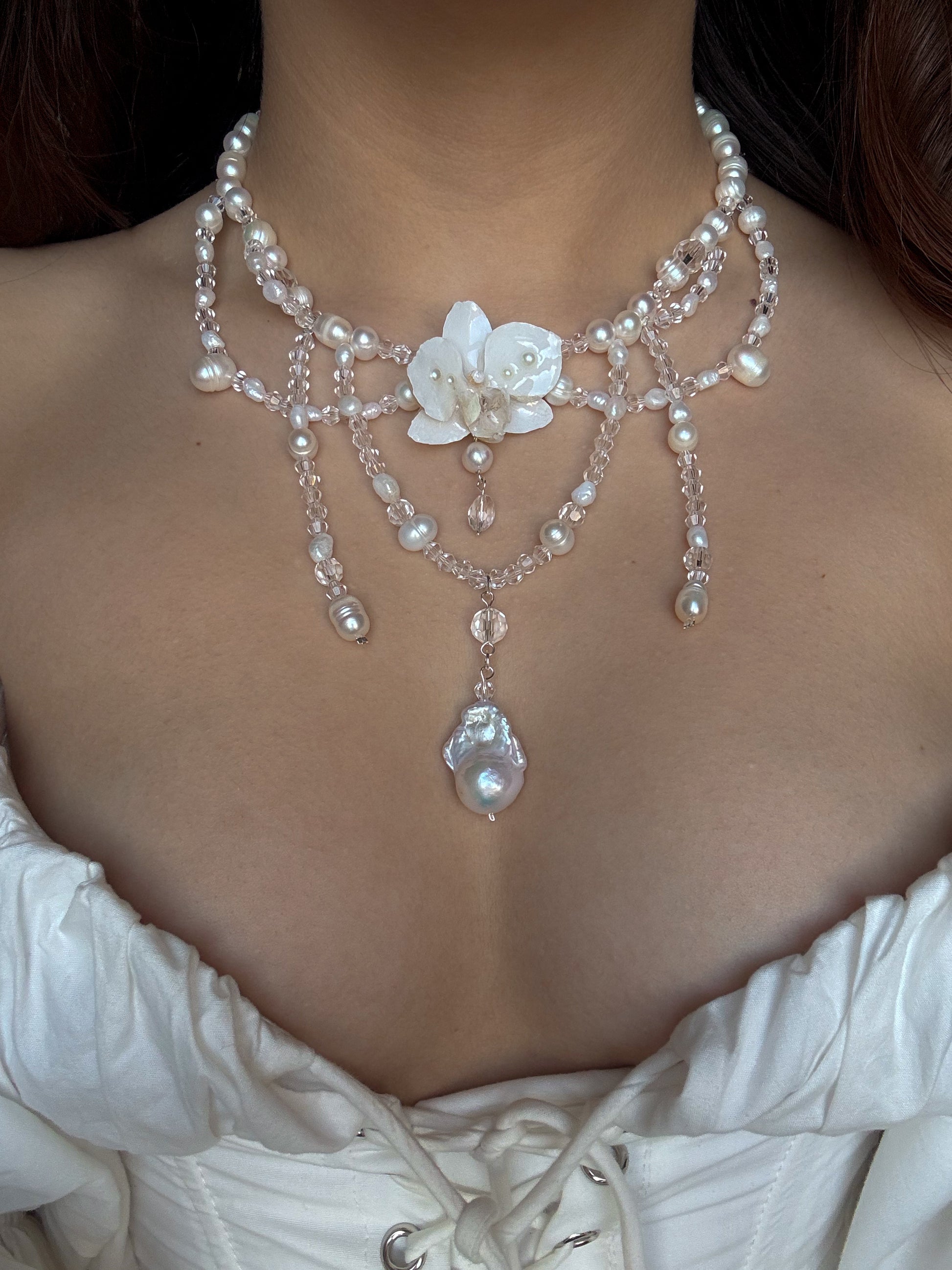 Keshi pearls, a phalaenopsis orchid centerpiece, freshwater pearls, and glass beads.
