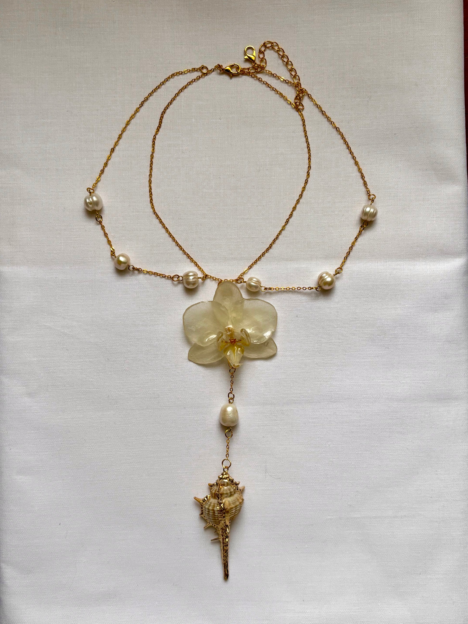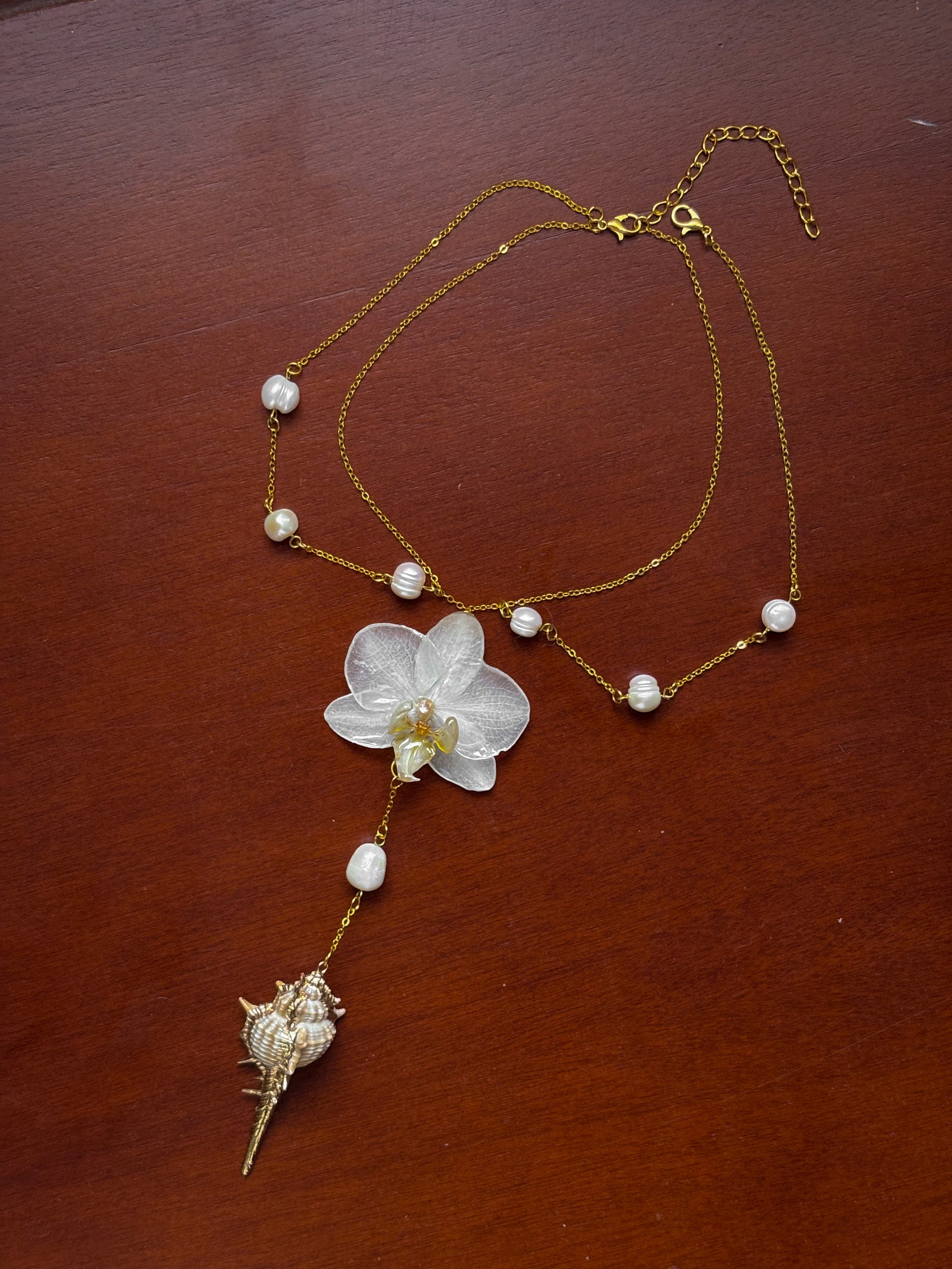 A translucent orchid and a spiral shell, strung on gold.