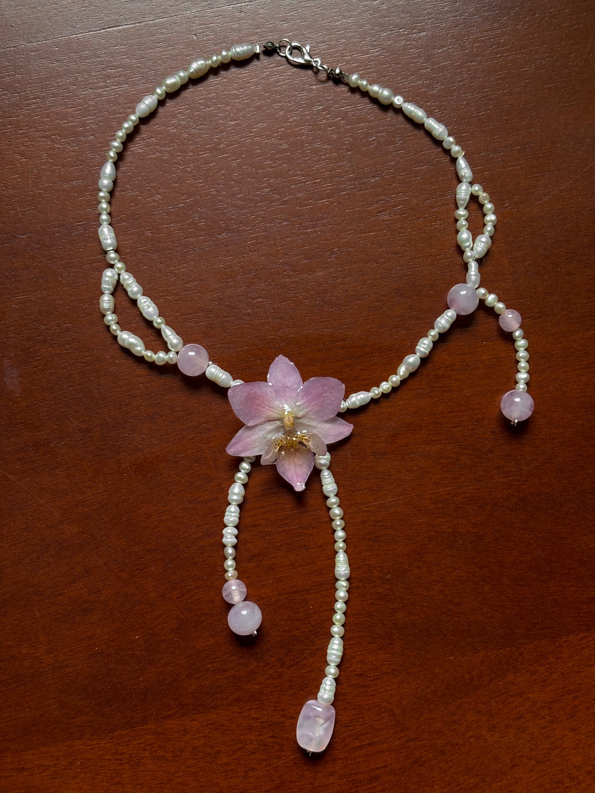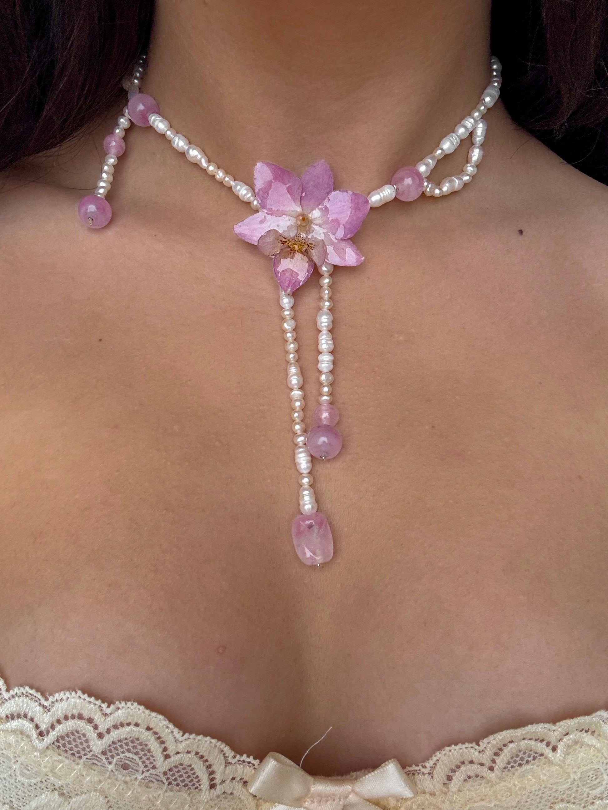 A tender pink orchid draped in pearls and rose quartz. A siren’s sweetest lie