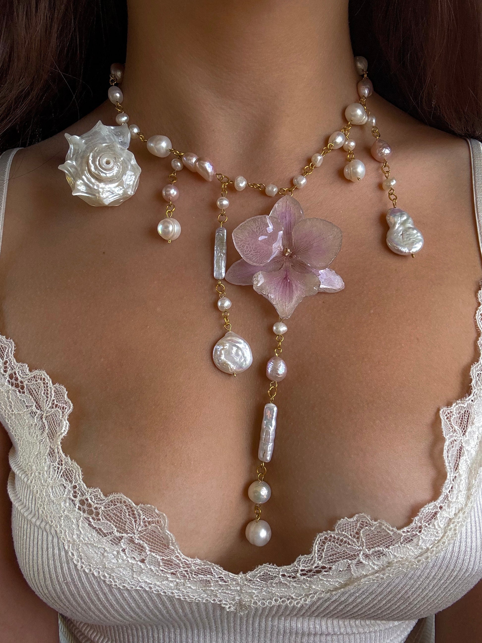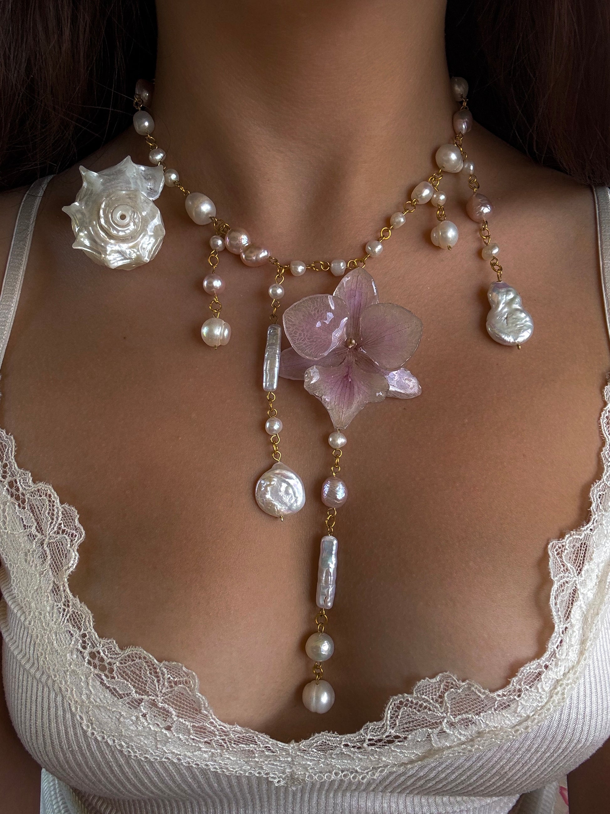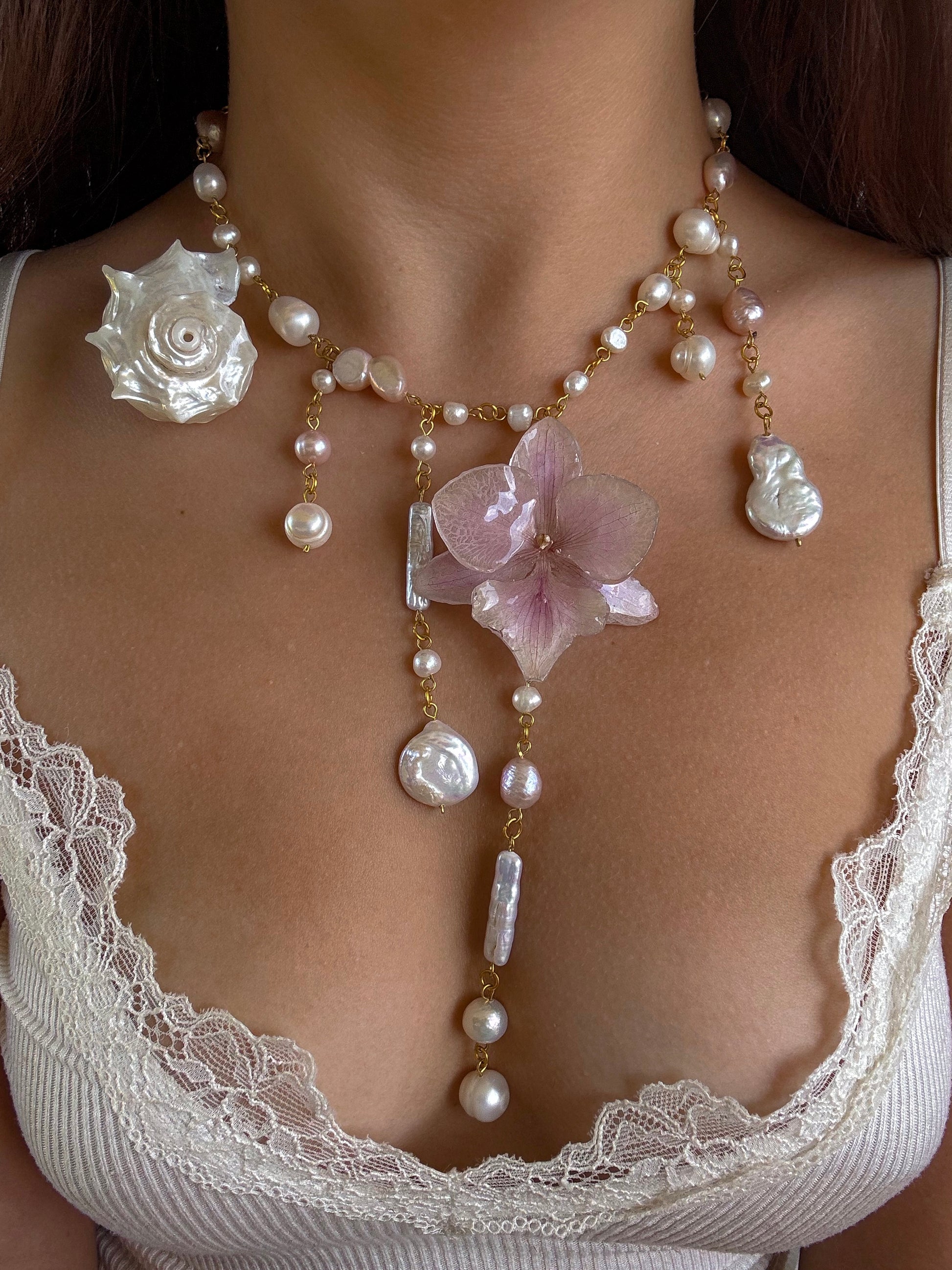 A pink Phalaenopsis-Dendrobium orchid, set with freshwater pearls, a glimmering shell and keshi pearls.