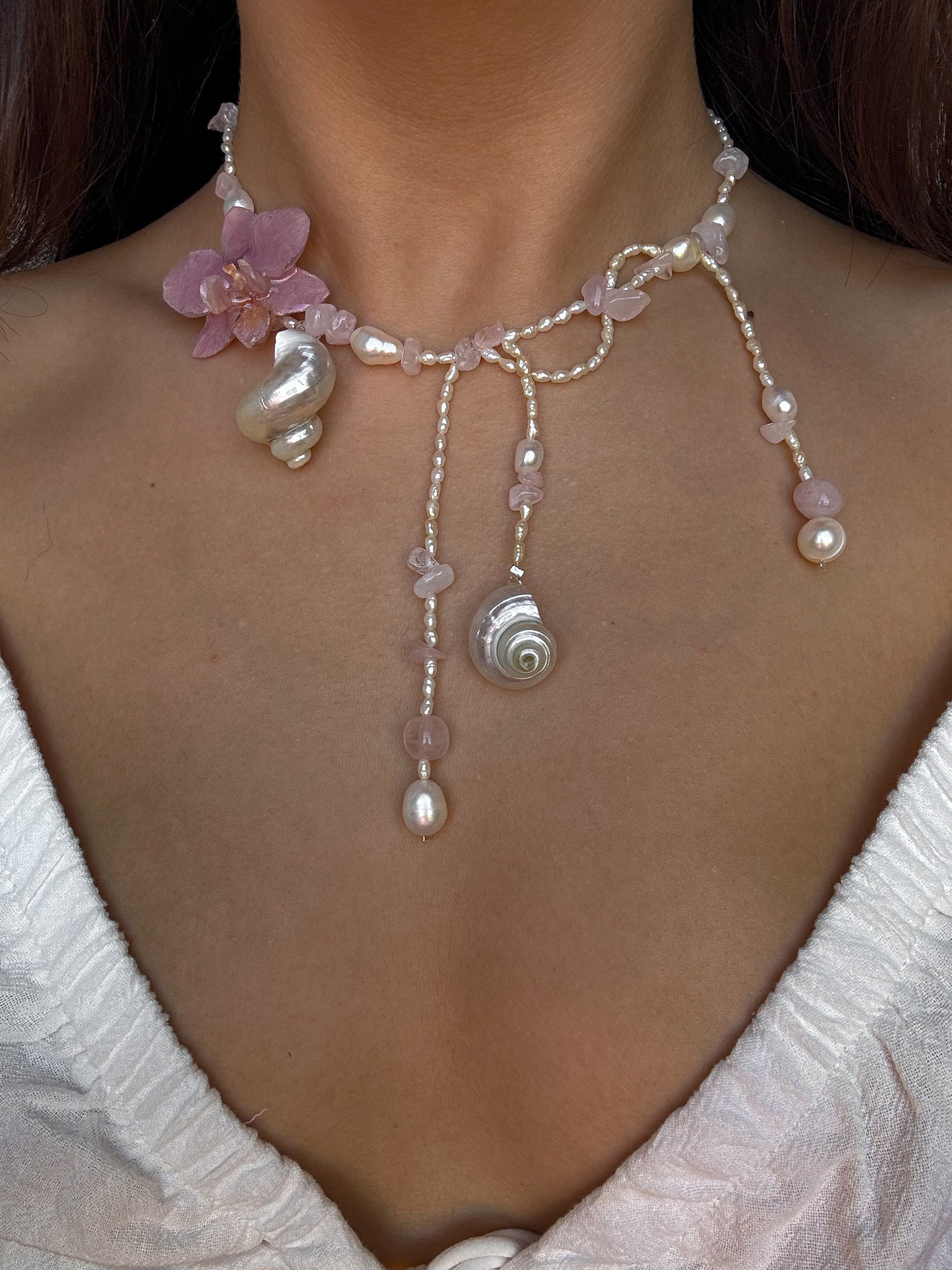 It moves like a warm tide through shallow waters—rose petals, pale pearls, and shells polished by years of quiet drift. To wear it is to carry that gentleness, though some warn that even the sweetest currents can pull you under.