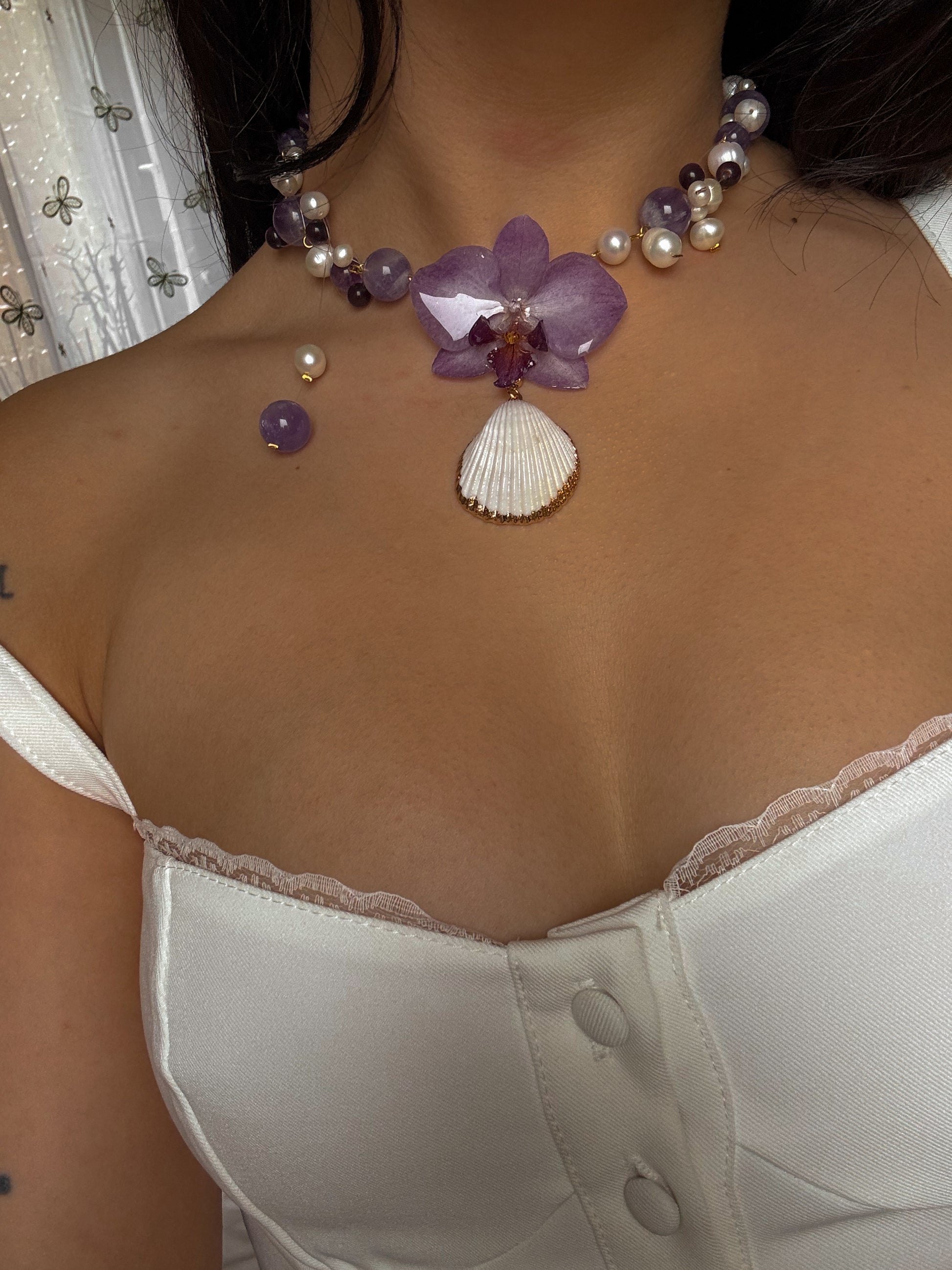 Real amethyst, freshwater pearls, and a hand-gilded shell with a soft lavender preserved orchid. Wear it with tousled hair and linen, or nothing at all.